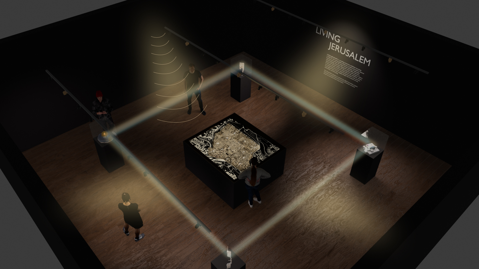 As visitors traverse the physical space between monuments, a temporal audio experience accompanies them on their journey. Directional audio speakers enable location-specific sounds to emotionally connect visitors to the old city of Jerusalem.