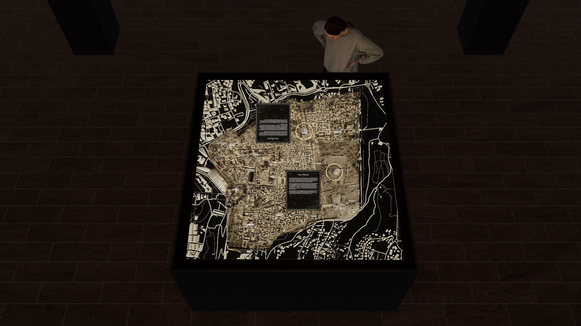 Using smartphone-based web AR, visitors scan 3D-printed monuments from the four quarters of Jerusalem. As users track around the models, they time travel through historical narratives from the 19th century to the present day.